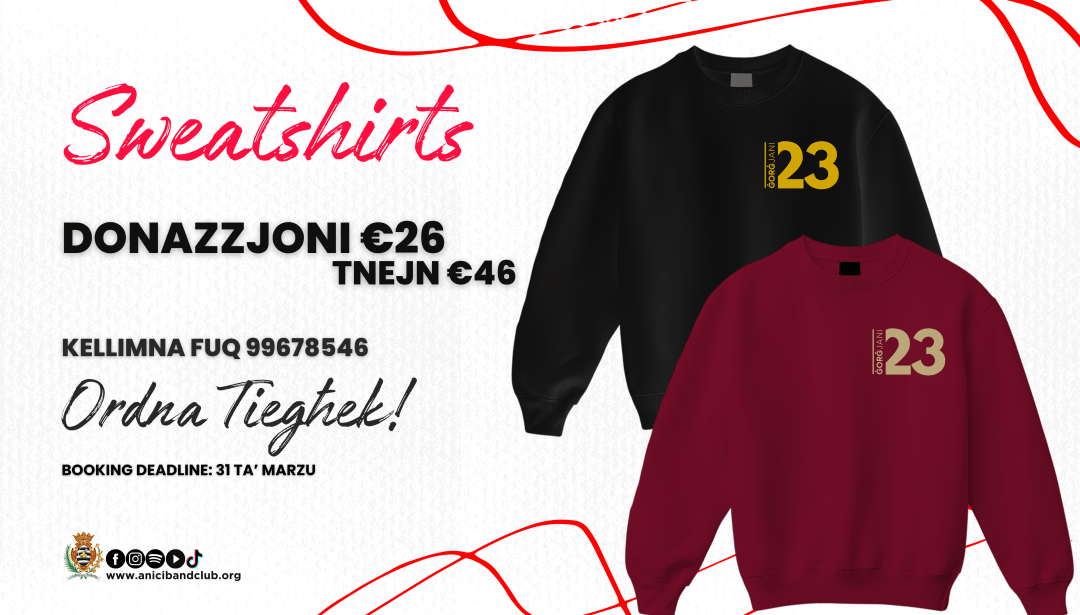 Applikazzjoni Imla l-applikazzjoni t’hawn taħt sabiex tirreġistra l-interess tiegħek fl-iSweatshirts tal-Festa Liturġika 2026. ← BackL-applikazjoni tiegħek hija mibgħuta. Se nkelmuk lura dalwaqt! Isem(required) Kunjom(required) Eta'(required) Numru tal-Identita' jew Passaport(required) Numru ta' kuntatt(required) Email(required) Qież tal-flokk Għażel(required) XS S M L XL XL XXL XXXL Metodu ta’ ħlas Għażel(required) Revolut (99678546) Cash Oħrajn Kwantita’ Għażel(required) 1 (€26 – Depożitu €10) 2 (€46 – Depożitu €20) Kulur (Iswed jew Aħmar)(required) Jien naqbel li l-informazzjoni personali tiegħi tinżamm fil-fajl sa 12-il (tnax-il) xahar ieħor mill-iskadenza tas-sħubija tiegħi. Fi tmiem dan il-perjodu, jew ladarba nirtira l-kunsens tiegħi, l-informazzjoni personali tiegħi titħassar jew tinqered. Għażel(required) Naqbel Ma Naqbilx Termini u Kundizzjonijiet 1. L-ordni tiġi aċċettatha biss mad-depożitu. 2. Il-flus ma jinatawx lura la darba l-ordni tkun saret, wara l-31 ta’ Marzu. 3. Dawk l-ordnijiet li sas-31 ta’ Marzu ma jkunx hemm depożitu kontrihom, awtomatikament jiġu kkanċellati. Għażel(required) Naqbel Ma Naqbilx Submit Δ
